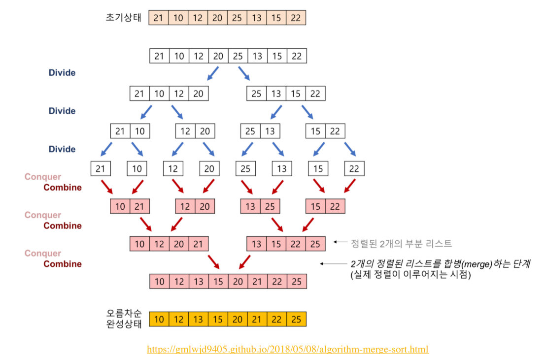 - Merge: 정렬된 부분배열들을 정렬